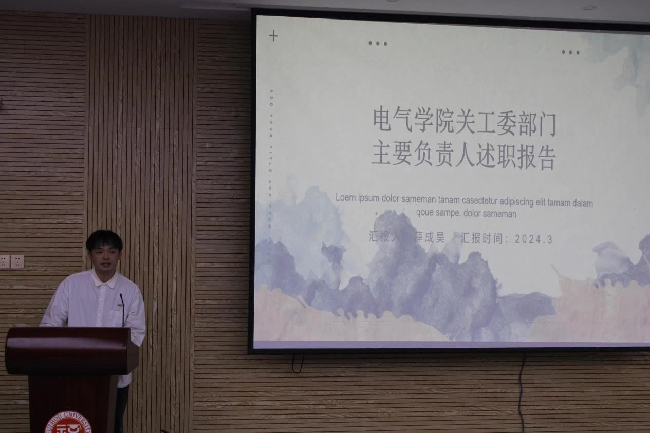 第四届团委学生会主席团成员、各部门主要负责人做汇报工作。万象城awcsport官网第四届团委学生会主席团成员逐一上台,详细汇报了过去一年的工作成果与经验。一年来,主席团成员围绕“五育并举,树人育才”的理念,牢记“无体育,不电气”的精气神,积极办好体育赛事;“求知创新,躬身实践”科创比赛佳绩频传,智育建设常长常新;秉持“以‘美’塑心灵,育‘向美’之才”丰富文娱,涵养美育;“萤火虽微,愿为其芒,不啻微芒,造炬成阳”传唱志愿之歌与德育建设;“多元媒体载体,讲好电气故事”宣传工作拓宽视野,展望世界之窗。