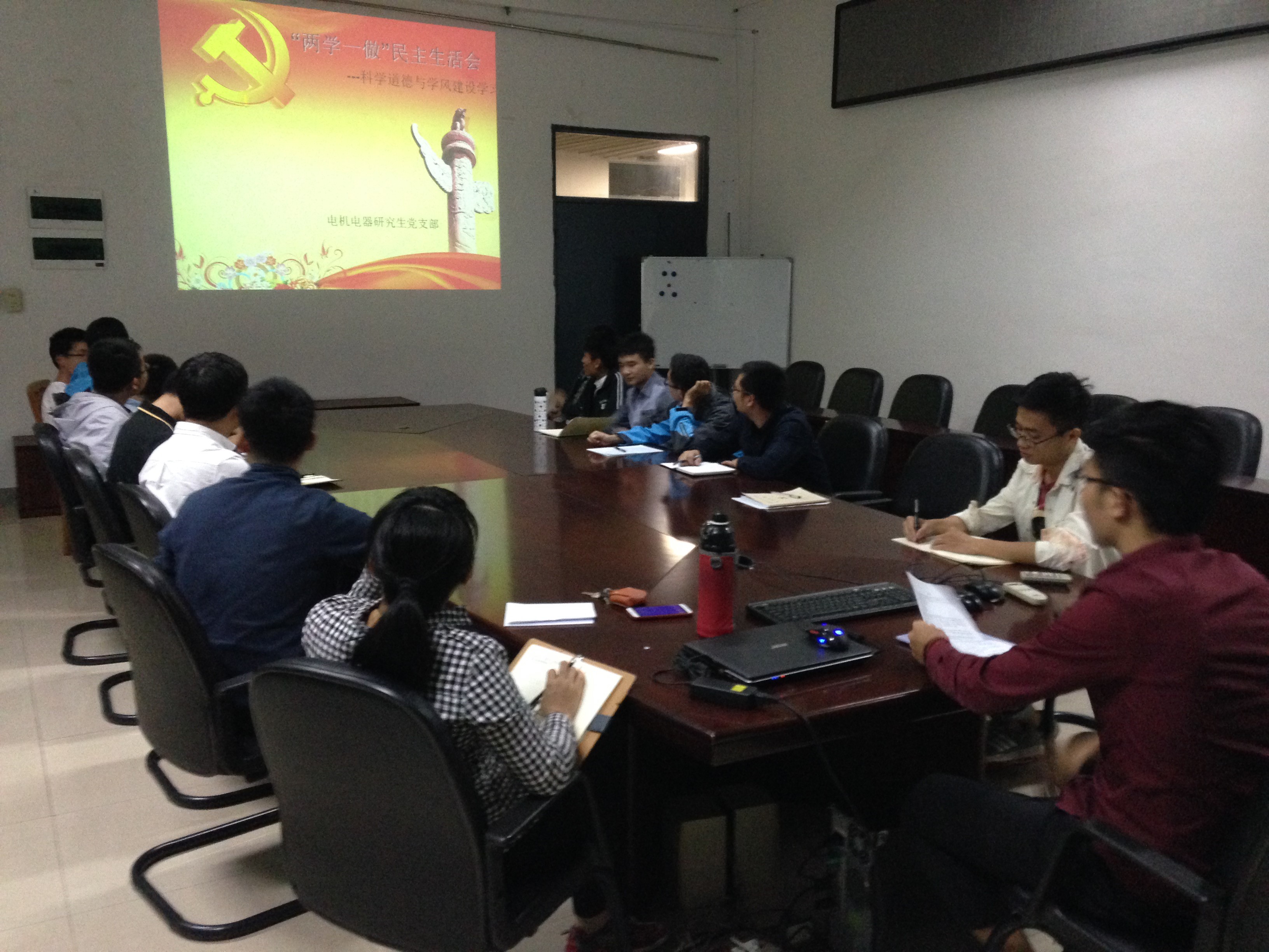 2016年10月30日晚上7点,电机电器研究生党支部 “两学一做”民主生活会在万象城awcsport官网会议室召开。此次会议由支部书记刘德军同志主持,研究生辅导员许海燕老师出席会议,电机电器研究生党支部13名党员同志参加会议。会议的主要内容为新老生党员同志见面交流以及组织党员同志们围绕科学道德与学风建设进行讨论学习。